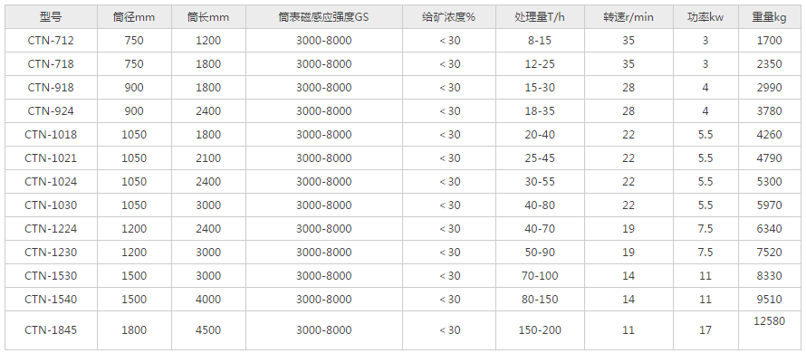 CTN型全逆流湿式磁选机其核心技术采用计算机模拟设计磁路,使磁选区的磁场分布更均匀,无空磁区,磁系大包角设计,滚筒表面磁场强度高可达8000gs。槽体和滚筒表面做特殊耐磨处理,耐磨有多种方式可选,使整机寿命大大延长。