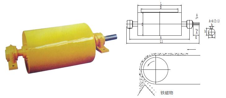 RCT型全磁滚筒与TD-75型、AD-80型通用固定式皮带输送机配套使用代替主动轮,也可与专用皮带输送机配套。